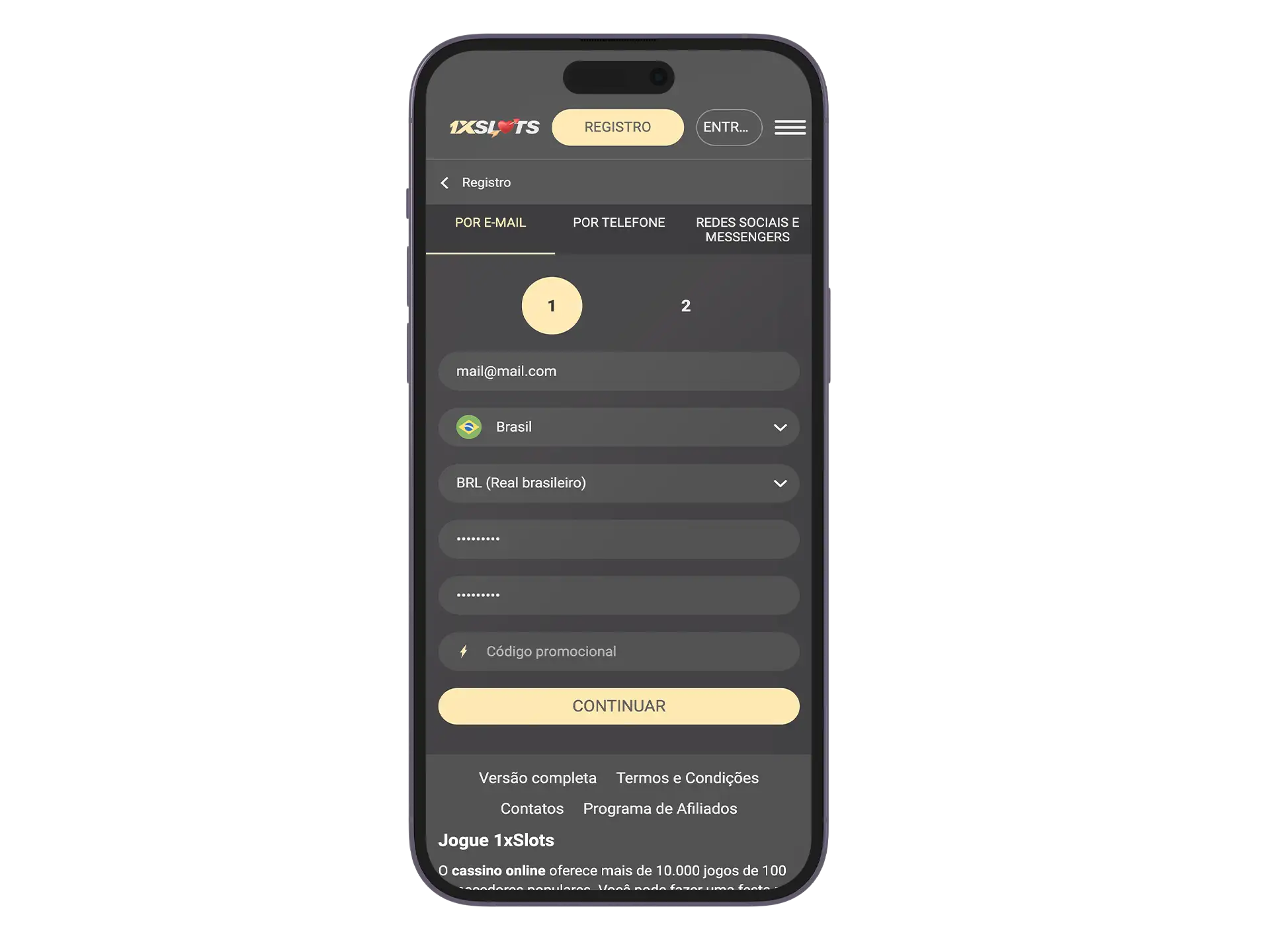 O cadastro pelo aplicativo da 1xslots é ágil e permite acesso imediato aos jogos favoritos em qualquer lugar. Veja como proceder: